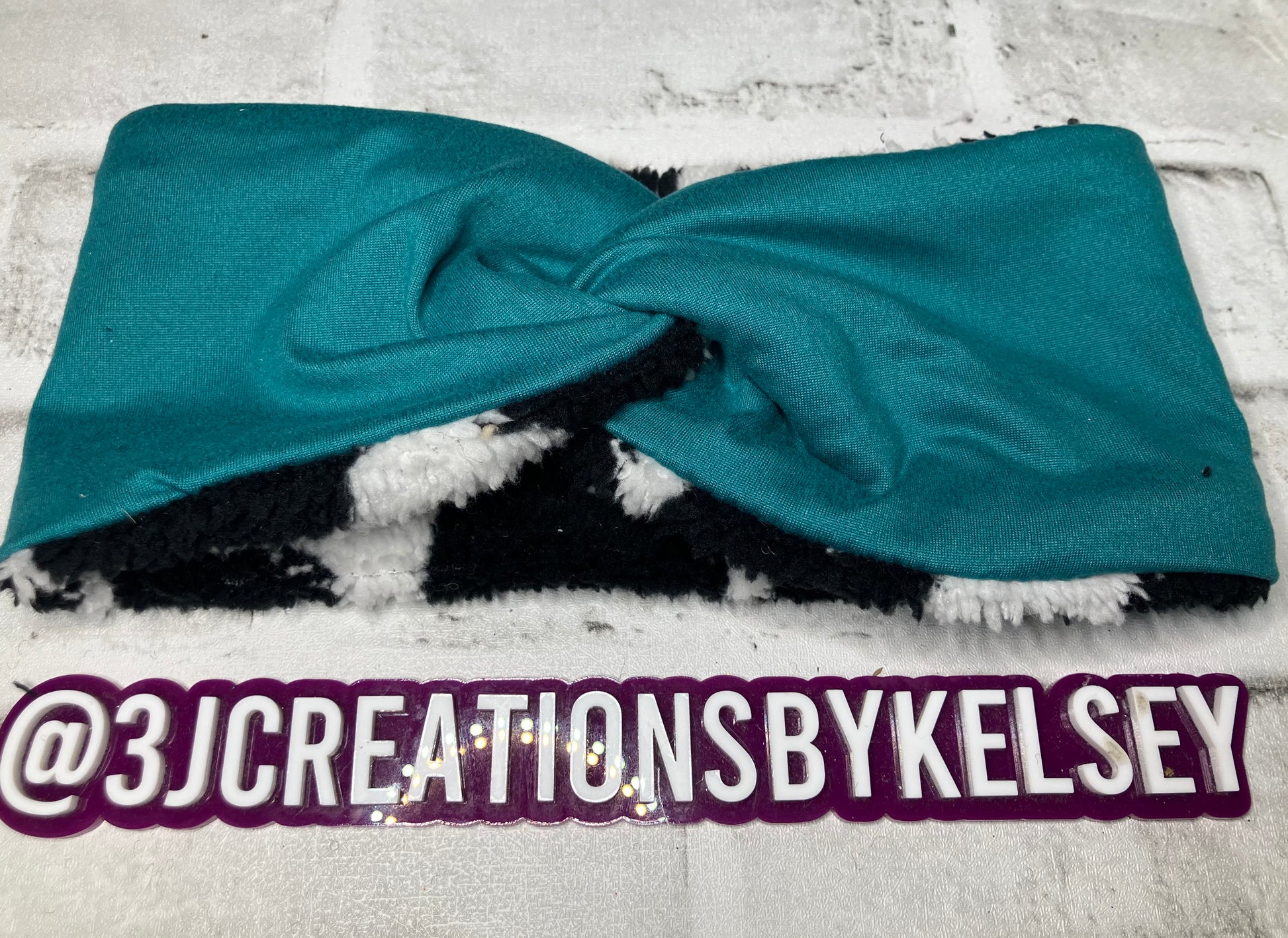 Teal with cow child ear warmers🪩